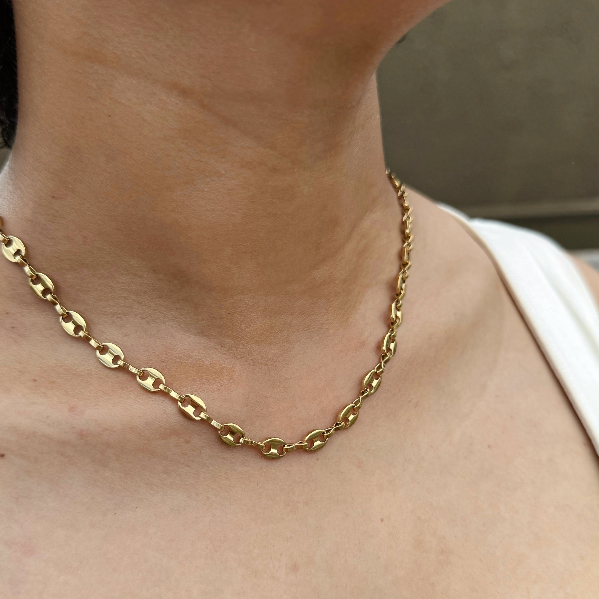 Un collar de eslabones dorados que combina fuerza y sofisticación. Su diseño robusto pero elegante lo convierte en una pieza statement, perfecta para elevar cualquier look con un aire de seguridad y estilo atemporal.